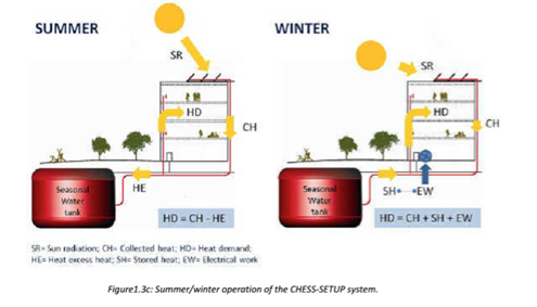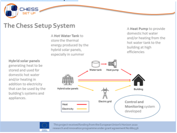 He said Chess Setup is a project funded by the European Commission, started in 2016 in the framework of the H2020 program and lead by Barcelona Ecologia. The acronym comes from "Combined HEat Supply System by using Solar Energy and heaT pUmPs". The project addresses the growing needs of heating and domestic hot water (DHW) in the building sector by proposing and testing a retrofitting solution based on the integration of renewable energy sources, and thermal energy storage capabilities.