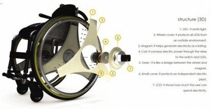 South Korean designers, including Min-Goo Kim, Yun-Jin Chang and Su-Eun Park, have designed an energy harvesting wheelchair that creates and accumulates electricity to power lights on the wheels.