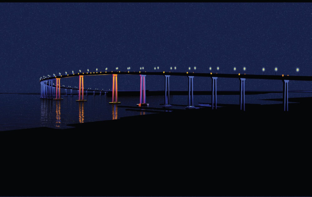 The lighting of the navigation span will express the nautical gateway function of the bridge and will have the capability to respond to the movement of larger ships. A secondary layer of lighting will light the bridge pillars. The San Diego-Coronado Bay Bridge, built in 1969 has a 2.5 mile long curved deck supported by over 30 towers reaching a height of 200ft over the navigation channel. The shipping channels are spanned by the world's longest continuous three-span box girder measuring 1,880ft.