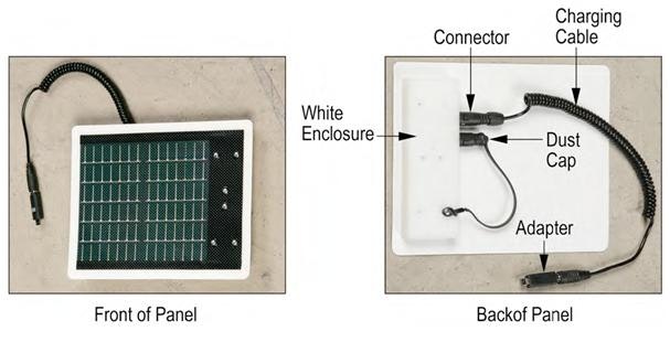 The solar panels are constructed of rugged, flexible, and non‐flammable materials able to withstand the sun's radiation, hot and cold temperatures, and wet and dry conditions. Cable assemblies, including cables, connectors, and receptacles, and electronics enclosure are also waterproof. Additional adaptors are also available.