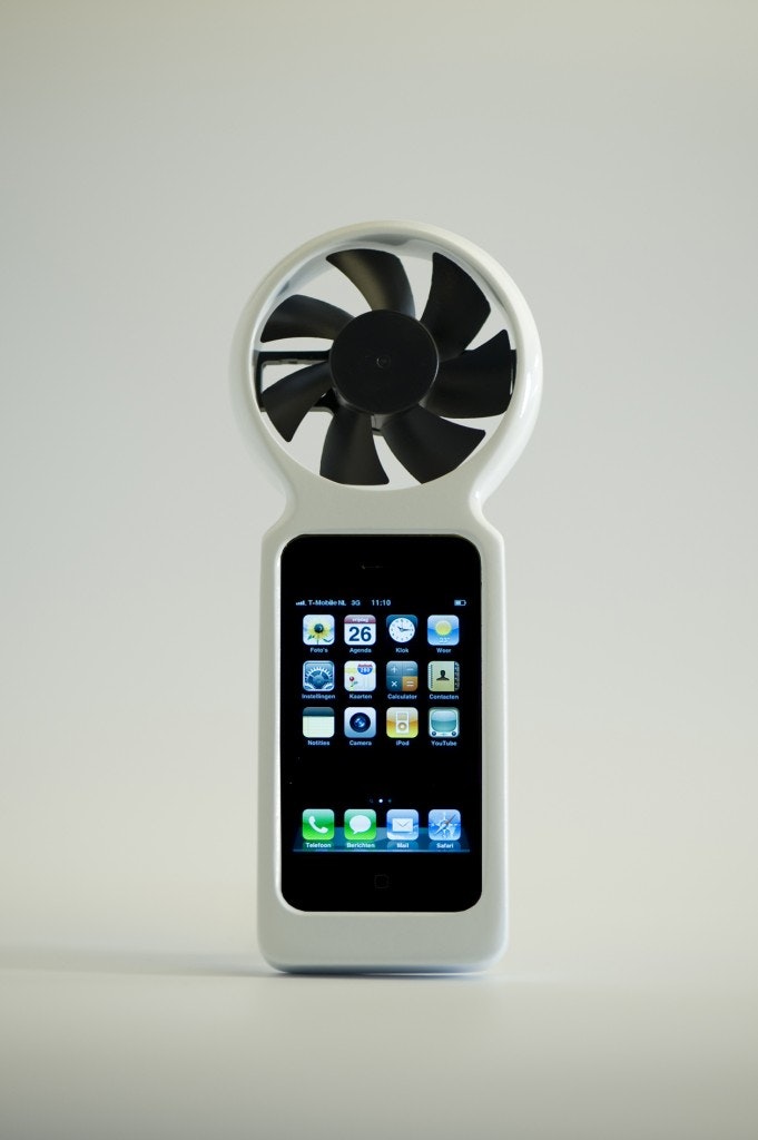Industrial designer Tjeerd Veenhoven, from the Netherlands, has come up with the Ifan. A hardware application in the shape of a soft rubber skin including an energy harvesting wind fan which slides around an iphone and recharges the phone when the wind blows.