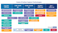 The current scale of carbon capture technologies for post-combustion capture, pre-combustion capture, DAC (direct air capture), and oxyfuel, as assessed by IDTechEx. Source: IDTechEx
