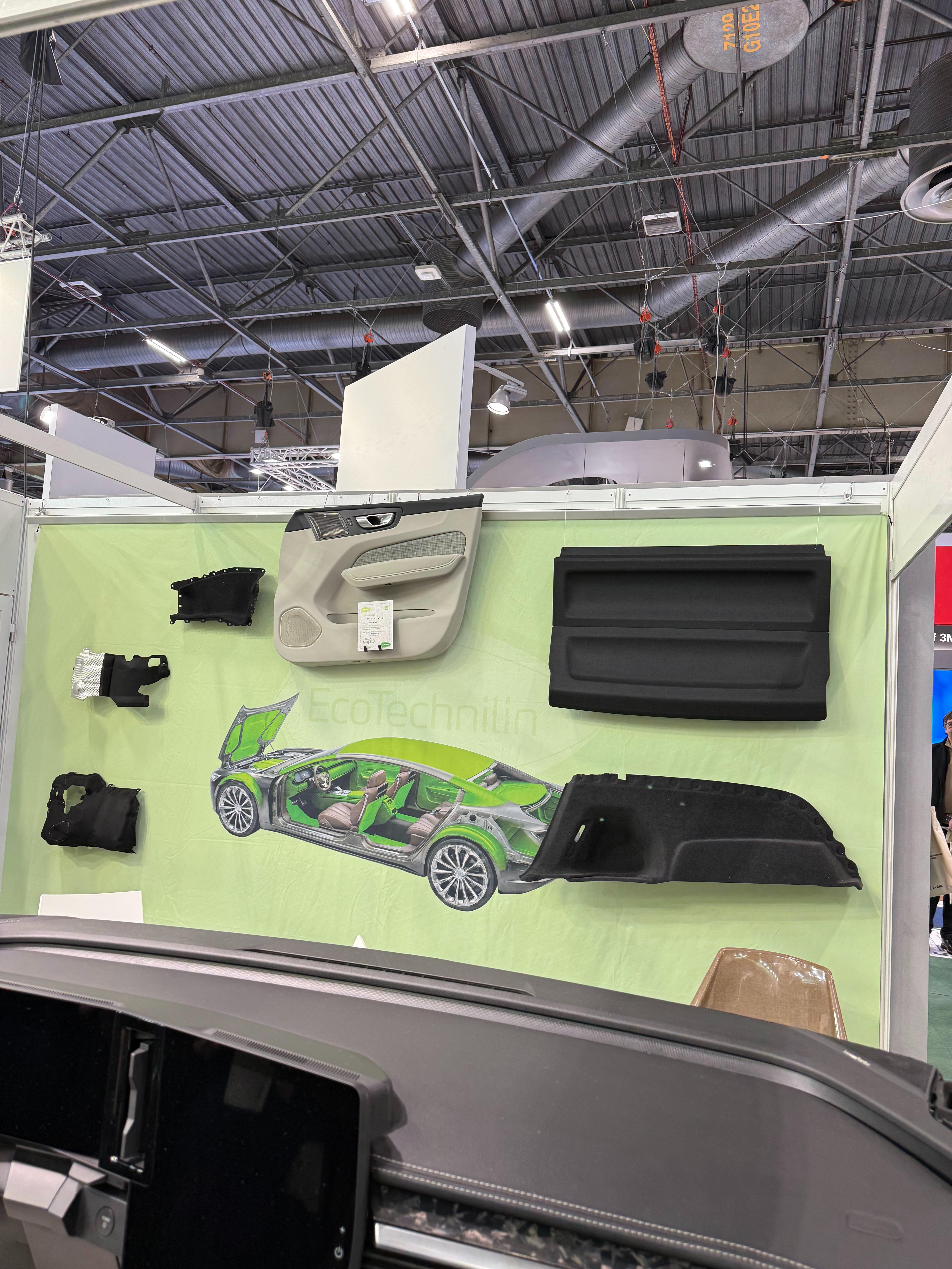 EcoTechnilin are a company specializing in the transformation of natural and recycled fibers to produce fabrics that can be used within automotive applications. In dashboards and doors, their fabrics can be used as a reinforcement material underneath leather, while the company also exhibited boot parts made from natural fibers. Volvo, Mercedes, and Porsche, were amongst a wider list of companies reportedly using EcoTechnilin's materials. In their efforts to work with predominantly recycled materials, including recycled polypropylene, and fibers such as flax, hemp, and kenaf, EcoTechnilin aims to minimize waste and promote a circular economy.