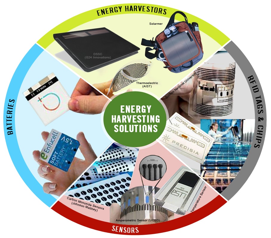 Printed electronics already offer an exciting toolkit for implementing EH solutions. This toolkit covers all essential elements of an EH system. Indeed, a diverse array of harvesters can be printed: organic photovoltaics and dye-sensitized solar cells can be printed to utilise solar energy, particularly from indoor lighting sources; printed piezoelectric scavengers can be used to harness vibrational energy; printed thermoelectric devices can exploit temperature gradients, for example.